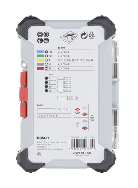Das Extra Hard und CYL-3 Set, 35?tlg. enthält alle Standardzubehörteile, die du für Schraubarbeiten und effektives Bohren in Beton und Stein benötigst. Die Schrauberbits bestehen aus wärmebehandeltem, S2-modifiziertem Stahl für Härte und Verschleißfestigkeit. Sie sind farbcodiert, damit du das richtige Bit einfacher findest. Mit den CYL-3 Bohrern aus dem Set kannst du in abrasiven Materialien wie Beton und Naturstein bohren. Das Set ist in einem Pick and Click-Koffer untergebracht, damit du deinen eigenen Werkzeugkasten zusammenstellen und deine Bits gut organisiert aufbewahren kannst.