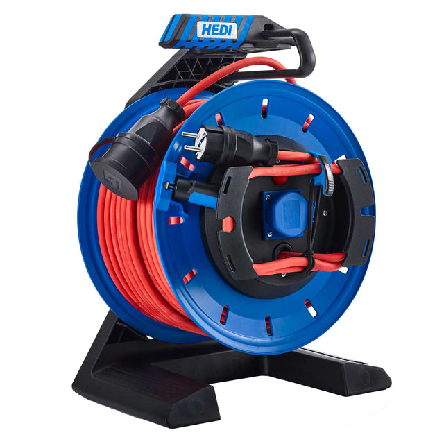 Die HEDI Vollkunststoff-Gerätekabeltrommel der Generation 7 „Champion“ kombiniert ein äußerst robustes Design mit cleveren Details für den Profi-Einsatz. Stabiler Tragebügel aus glasfaserverstärktem Kunststoff, blauer Kunststoff-Trommelkörper (Ø 290 mm) und spritzwassergeschützte Ausführung IP54 sorgen für lange Lebensdauer.