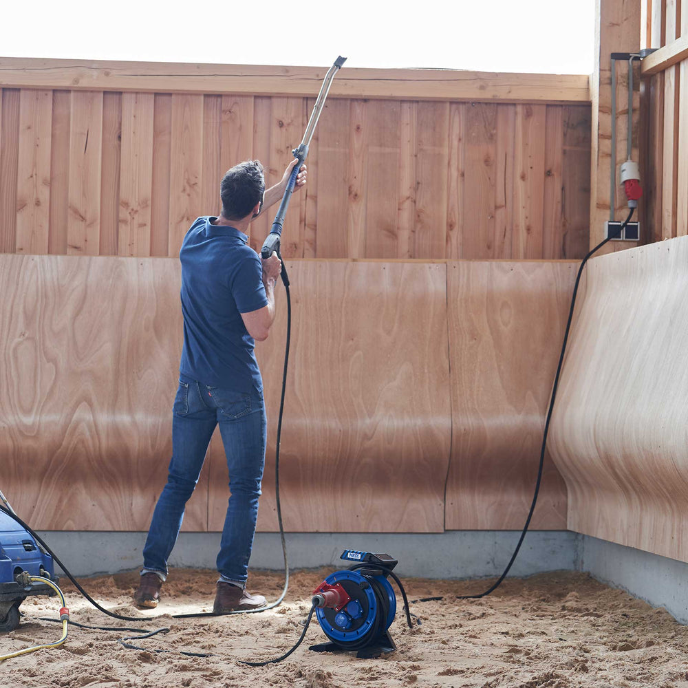 Mit ergonomischem Soft-Touch-Griff, Drehgriff, breiten Trommelfüßen und Rotationsstopp-Schalter ist diese Trommel perfekt für den täglichen Einsatz geeignet. Die patentierte 7°-Trommelneigung optimiert die Balance beim Auf- und Abwickeln. Dank IP44-Schutz ist die Trommel spritzwassergeschützt und somit auch für den temporären Außeneinsatz geeignet.