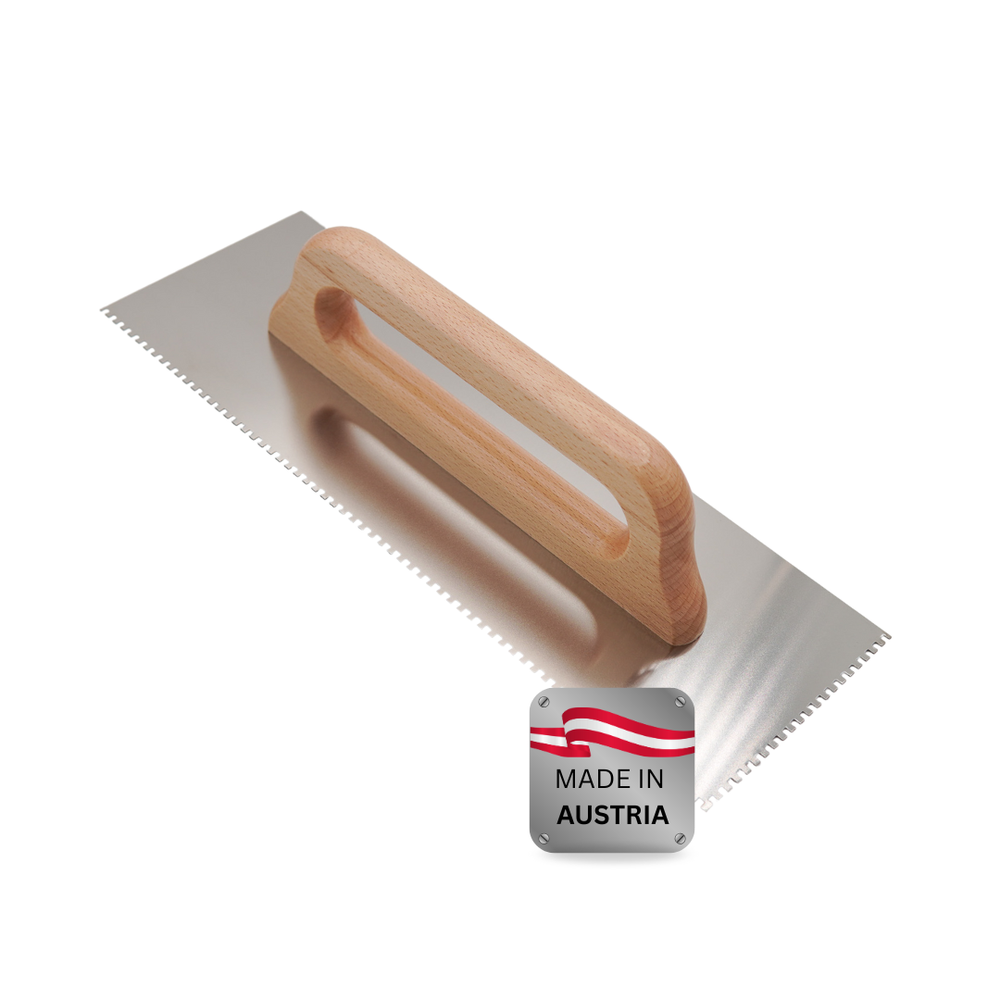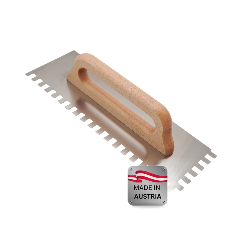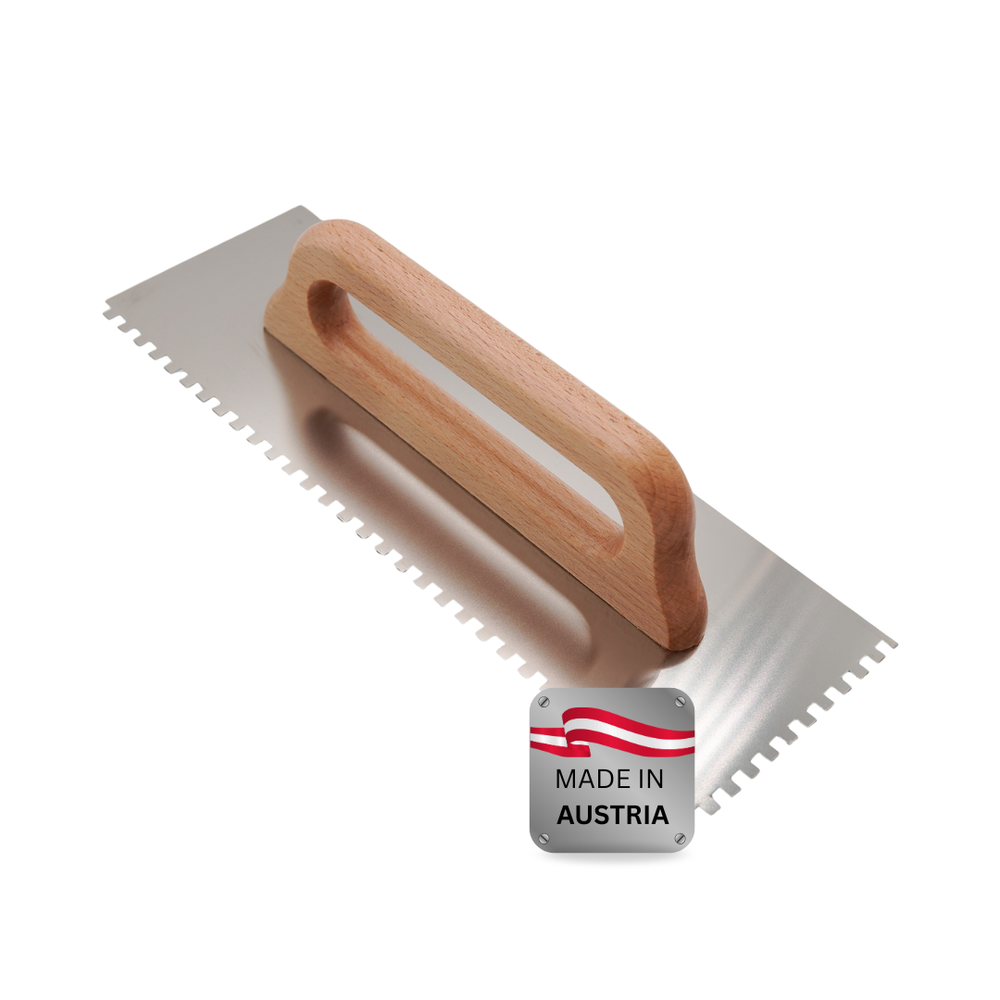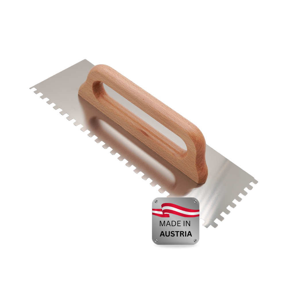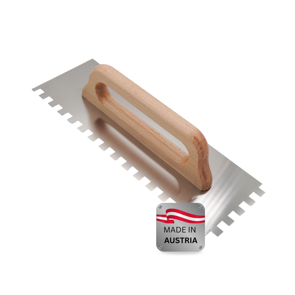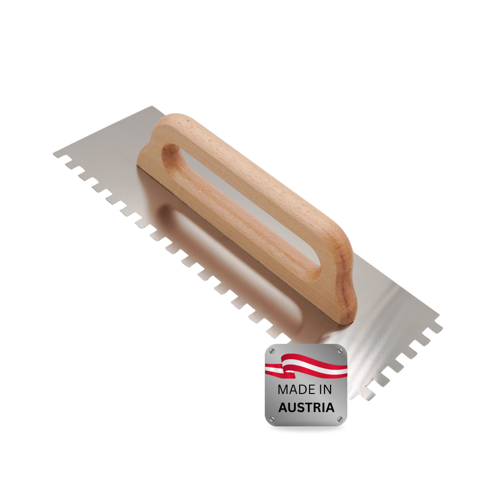 Der ergonomische Echtholzgriff liegt angenehm in der Hand und sorgt für sichere Führung – auch bei längeren Arbeitseinsätzen. Durch die Auswahl unterschiedlicher Zahnungen (E4, E6, E8, E10, E11 und E12) lässt sich der Materialauftrag exakt an Untergrund, Klebertyp und Belagsgröße anpassen.